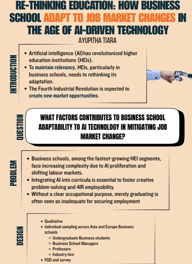 Your research question is somewhat better, but is not in coherence with your title. You have three factors of analysis in your RQ: Business Schools’ adaptability, AI technology, and job market change. You need o better understand how you will be approaching these three factors and how they relate to each other in your research. Your approach will be determined by the theoretical perspective that you adopt for your study. You should be clear on this from the start.
