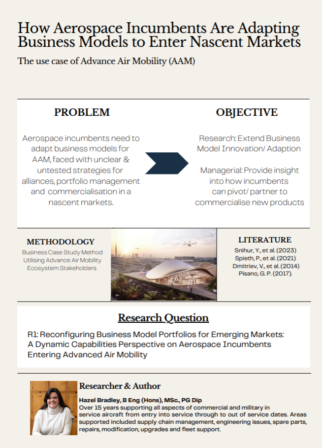 Also, your research question is not well redacted. It should be a question, not a statement. It should represent the main question that your study is trying to answer. Taking time to formulate a good research question is important as it will serve as the beacon that guides you throughout your research and helps you avoid deviations and superfluous contents (effort). From your poster, I feel that your title is probably closer to a RQ and your RQ is closer to your title. Maybe something like “How are aerospace incumbents renewing their business models to…..”